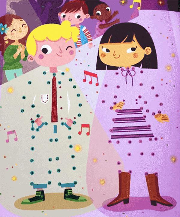 在上圖中,孩子按照數字規律,從1,2,3以此類推連到最大數字,兩個孩子的衣服就穿好了。