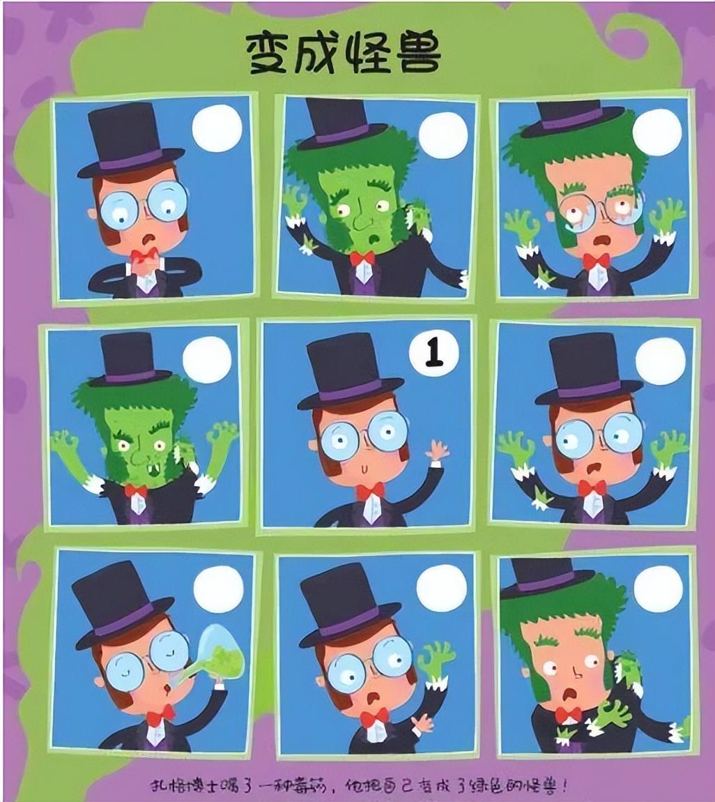 這頁的“變成怪獸”,可以引導孩子一邊填序號,一邊講故事,來提升孩子的邏輯推理跟語言表達能力。