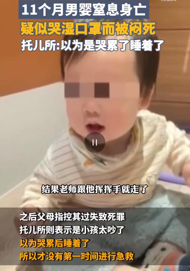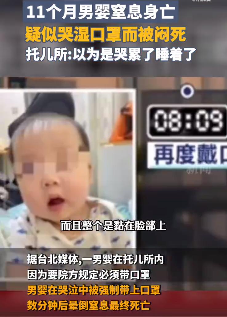 小小的孩子剛來到這個世界上不到一年,他還渴望着跟着爸爸媽媽一起成長,渴望着多看一眼這個花花世界,沒想到因爲父母上班比較忙,把他放在託兒所,託兒所又要求必須要戴口罩,這個聽話的孩子卻因爲太聽話,一直堅持戴着口罩,導致口罩把他的生命通道堵住了,完全沒有辦法呼吸,結果被悶死。