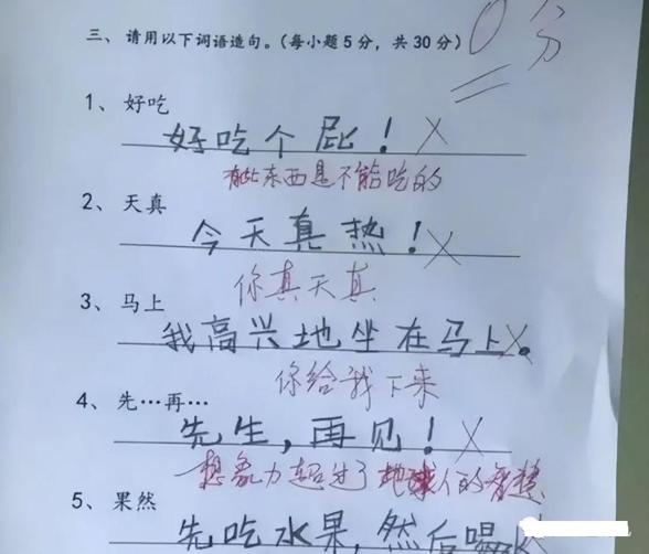 讓用“先...再”造句,這孩子造的是:先生,再見!難怪老師給出了想象力超越了地球人的評語。