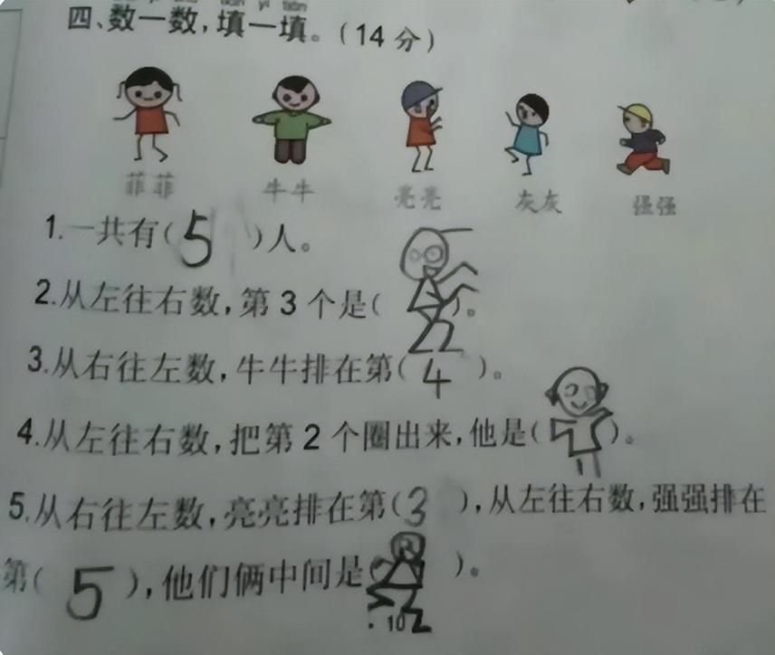 最讓人捧腹大笑的還是這個孩子,題目讓把對應人的序號填到括號中,這孩子倒好,硬是在數學試卷上展示出了自己的美術功底,還別說,每個括號畫的還真對上了。