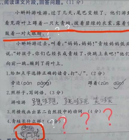 愛在試卷上畫圖的,還遠不止一個孩子,看這個孩子在語文閱讀理解題上,讓描述“青蛙長什麼樣子”,人家倒好,直接給你畫了一隻青蛙,還比說,挺形象的。