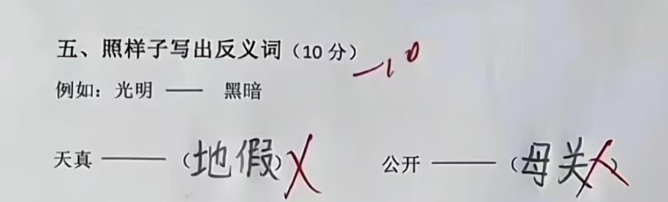 題目讓寫反義詞,孩子只看到了反義,沒有看到詞,於是乎就寫出了“天真對地假,公開對母關”。