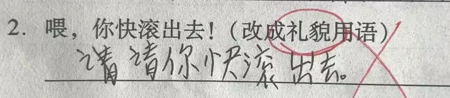 詞語尚且如此,仿句題更是被改的面目全非。題目讓用“禮貌用語”,這孩子倒好,寫的是:請你快滾出去!這很禮貌嗎?