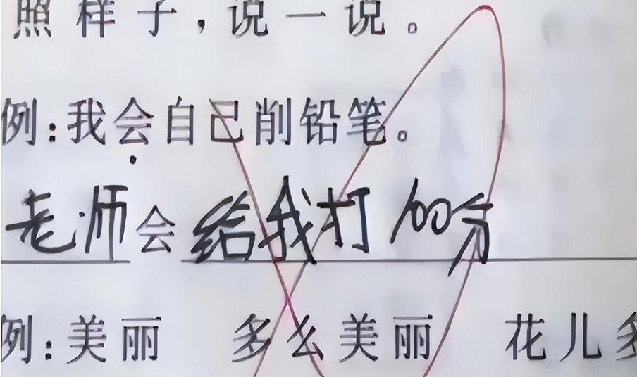 讓用“會”造句,人家寫的是:老師會給我打100分!哈哈哈,真佩服這孩子的勇氣,老師可能給不了你100分,大紅叉可以有。