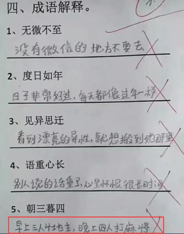 再來看“成語解釋”,真的是刷新了老師們的眼界,朝三暮四,人家寫的是:早上3人鬥地主,晚上4人打麻將,我猜這孩子家裏一定是開麻將館的。