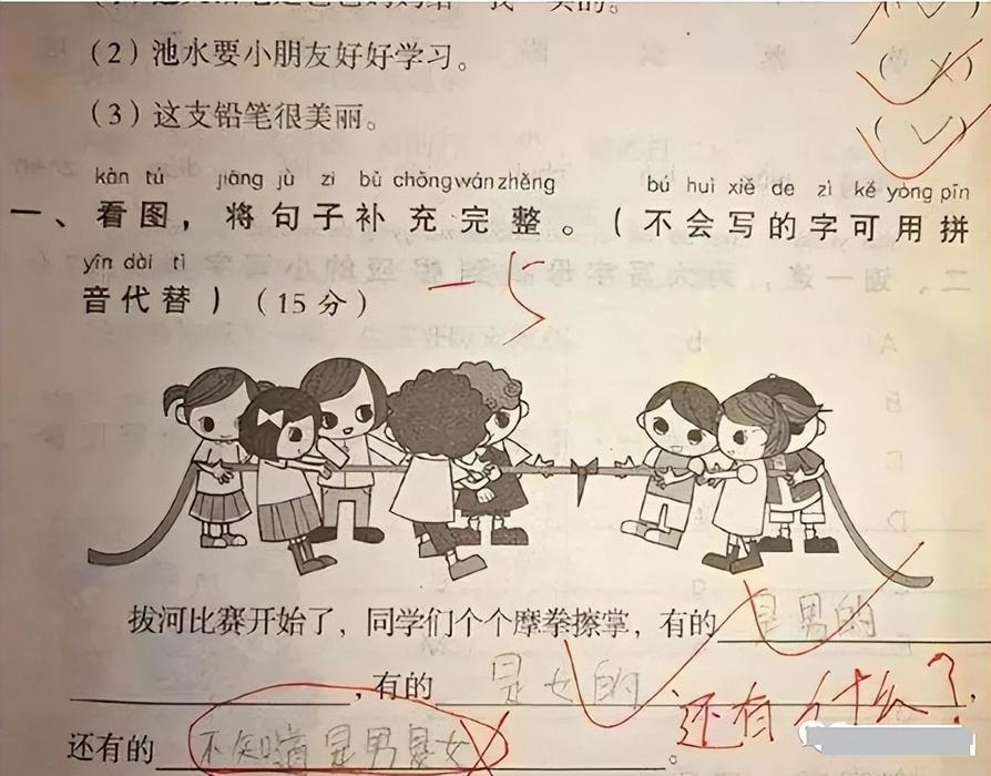 看圖寫話跟作文,也是歡樂多,一羣孩子在玩拔河比賽,讓用“有的...有的...還有的...”造句,人家孩子寫的是:有的是男的,有的是女的,還有的不知道是男是女。