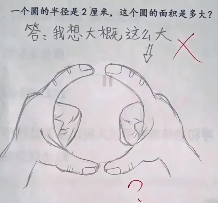還有做應用題的,題目告訴了一個圓的半徑是2cm,讓求圓的面積,別說,這孩子的美術功底還不錯,畫的圓的確很圓,可惜老師不給分啊。