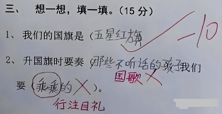 鄰居家孩子這次語文考了46分,全部倒數第一名,媽媽覺得特難爲情,開家長會都不好意思去。但看到孩子答的題,真是讓她哭笑不得。比如這道升國旗是要奏(),我們要(),這完全是課文原文的送分題啊。