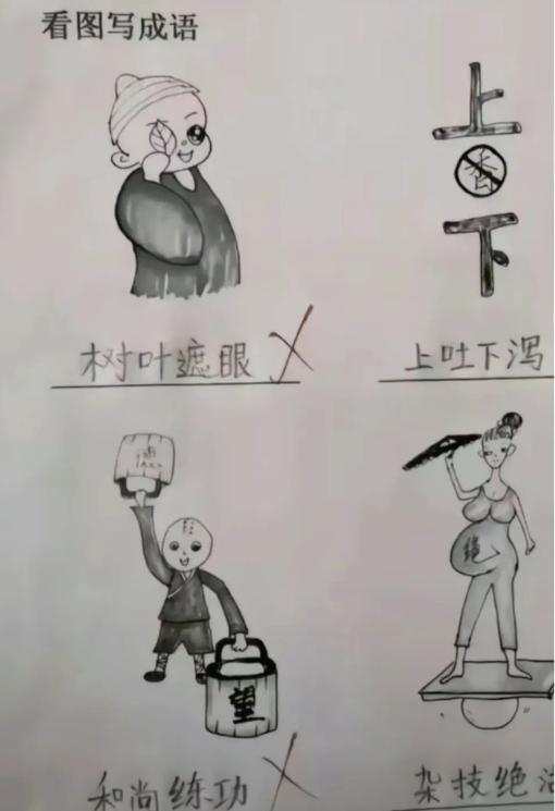 又如這道題,讓看圖寫成語,看這孩子一個個寫的,每個都寫了,可沒有一個是對的。