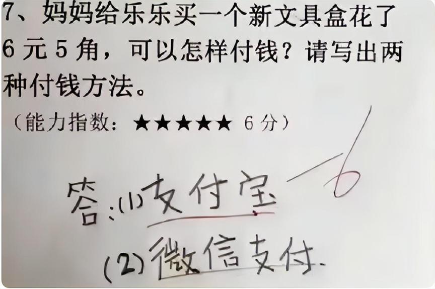 題目問買一個文具盒花了6元5角,問可以怎麼付錢?要求寫出2種付錢方法,結果孩子給寫的是:支付寶跟微信支付!