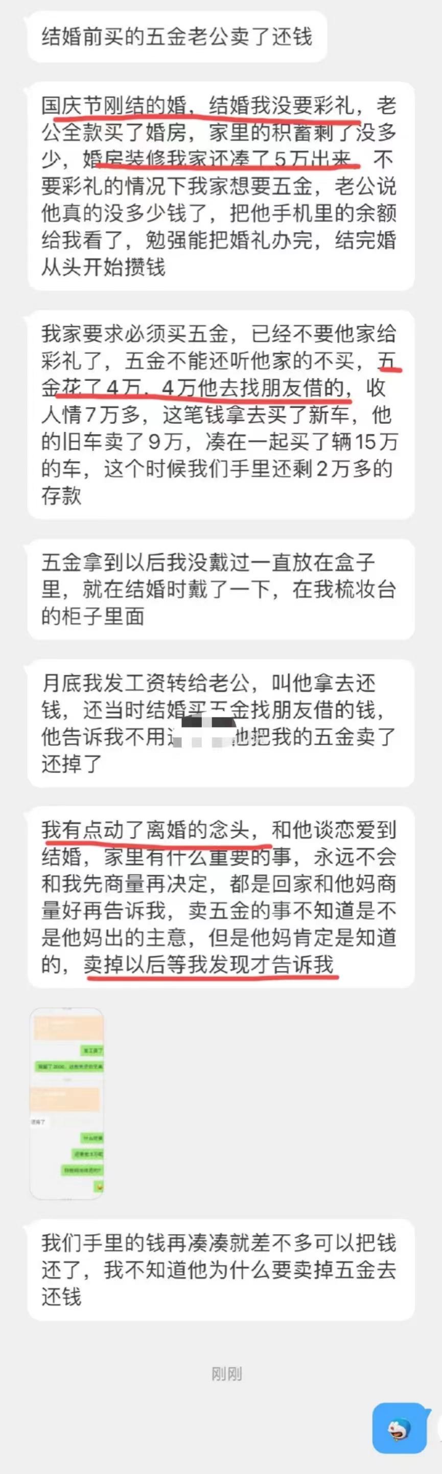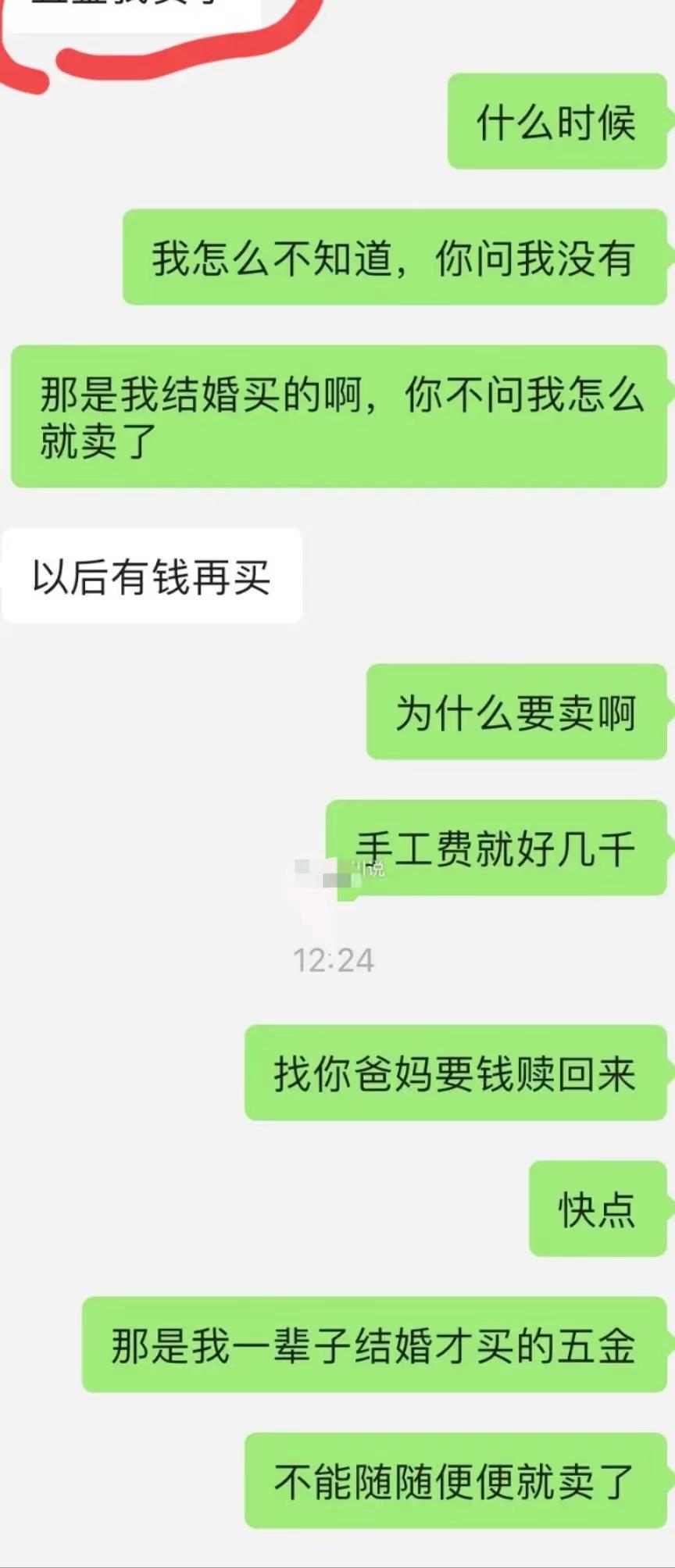 要知道五金是婚禮上的一種儀式感,剛結婚就把五金給賣了,而這個五金是花4萬塊錢買的,而且還要手工費,手工費也要好幾千,這賣出去就直接是虧錢了,一輩子結婚纔買的五金,隨隨便便就賣了。