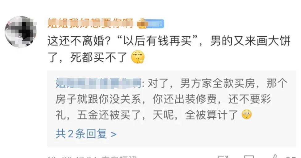 這些截圖讓網友們實在是非常的憤怒。一個網友說:還不離婚,以後有錢再買,男的又來畫大餅了,死都買不了!