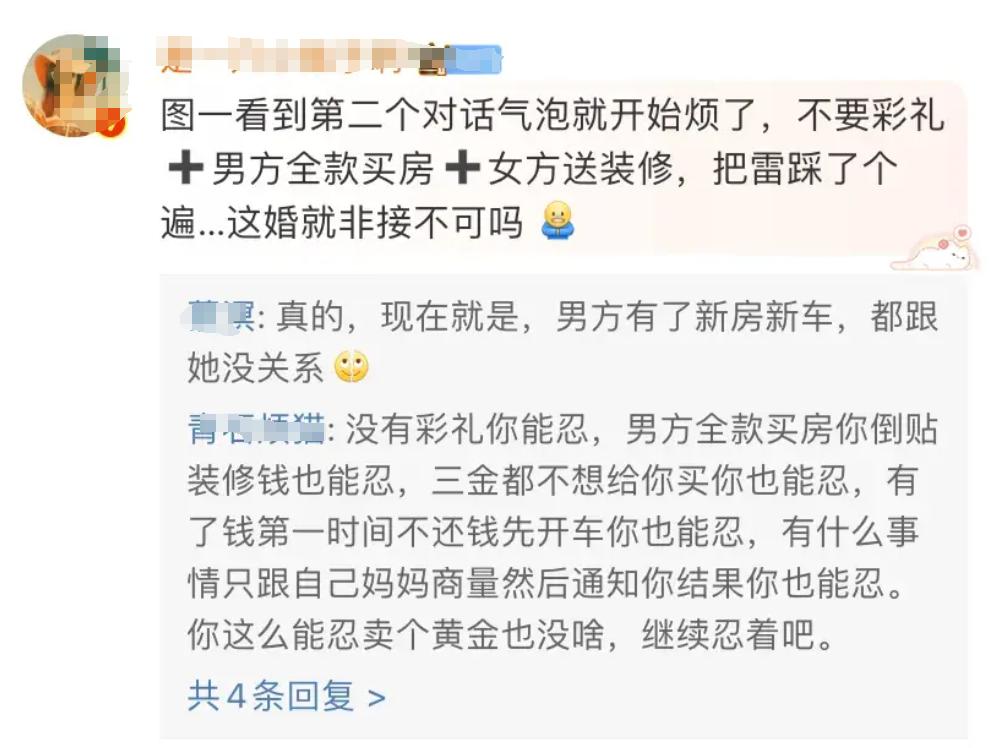 更有網友看出了這個本質:女的不要彩禮,男的全款買房的話,女的還送裝修,把雷踩了個遍,這婚非結不可嗎?