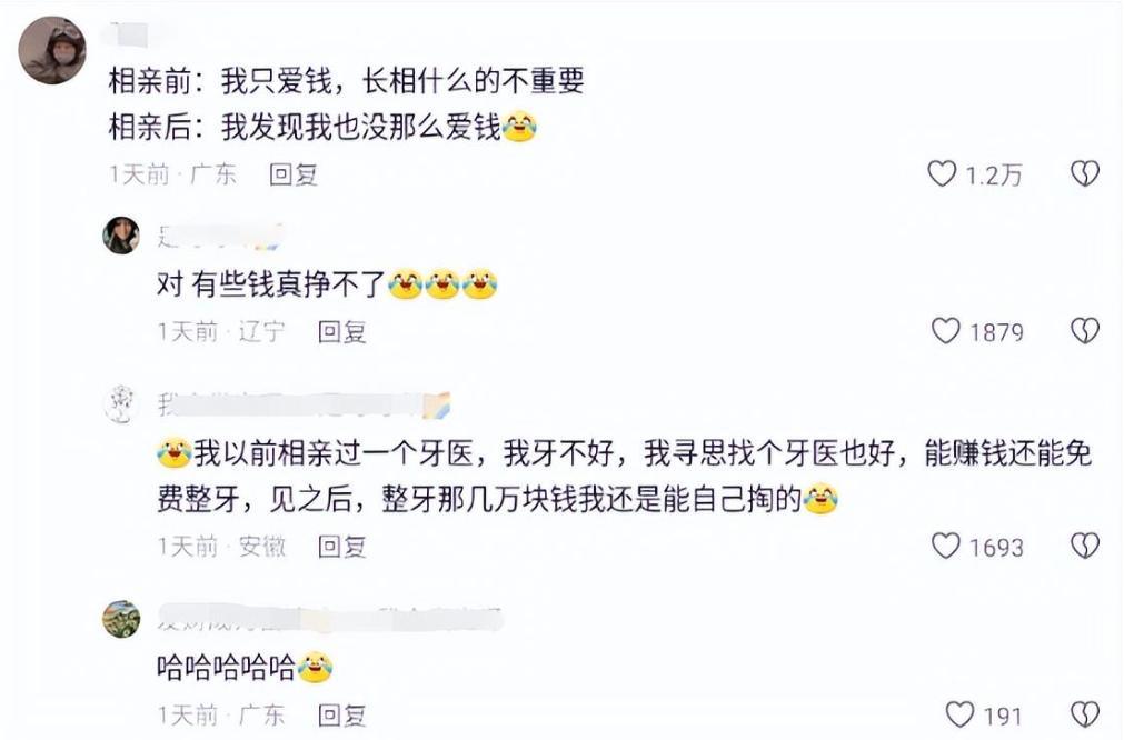 有網友說在自己相親之前覺得只要有錢就行,長成什麼樣的不重要,結果在相親之後發現自己真的沒有那麼愛錢,有些錢真的掙不了。
