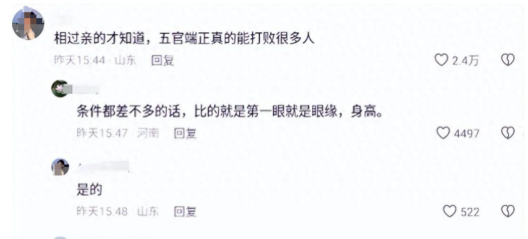 不少網友在沒相親之前就覺得長得過去就行了,甚至很多在外地工作的,比如說是白領的,身邊的都是俊男美女,就覺得正常的人都是五官端正,結果相親的時候才發現五官端正就可以打敗很多人。