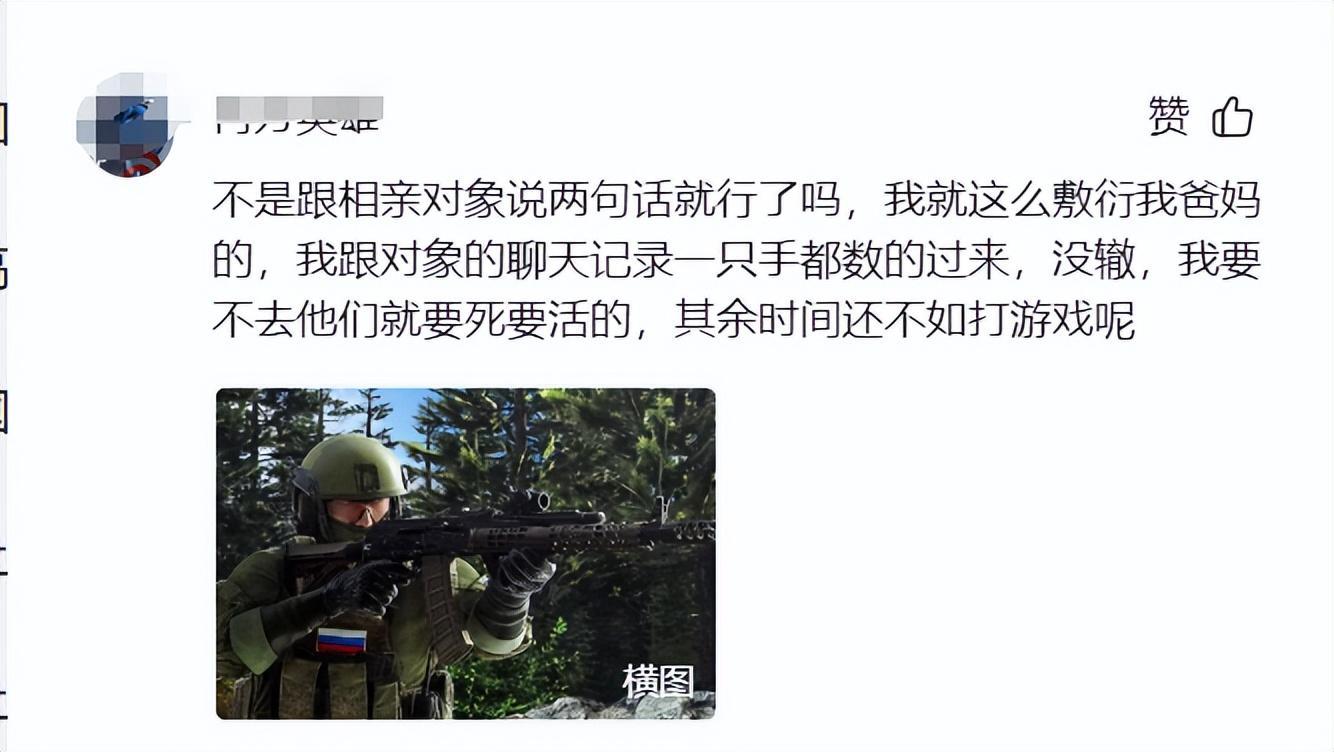 有網友說自己是被父母逼着去相親的,所以就去相親的時候跟相親對象說兩句話忽悠一下爸媽,就回來打遊戲了。