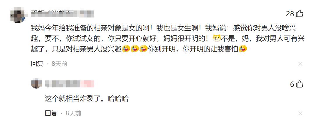 一個女性網友說,她媽媽今天給她準備的相親對象是女的!因爲她媽媽說“感覺你對男人沒啥興趣,要不你試試女的,只要你開心就好,媽媽很開明的”。網友說:媽,我對男人可有興趣,只是對相親的男人沒興趣。
