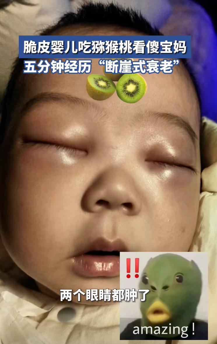 而孩子在喫了獼猴桃過敏的時候,看起來就像一個小老頭,也就是兩口獼猴桃就放倒了一個孩子,讓7個月的嬰兒出現了斷崖式的衰老。