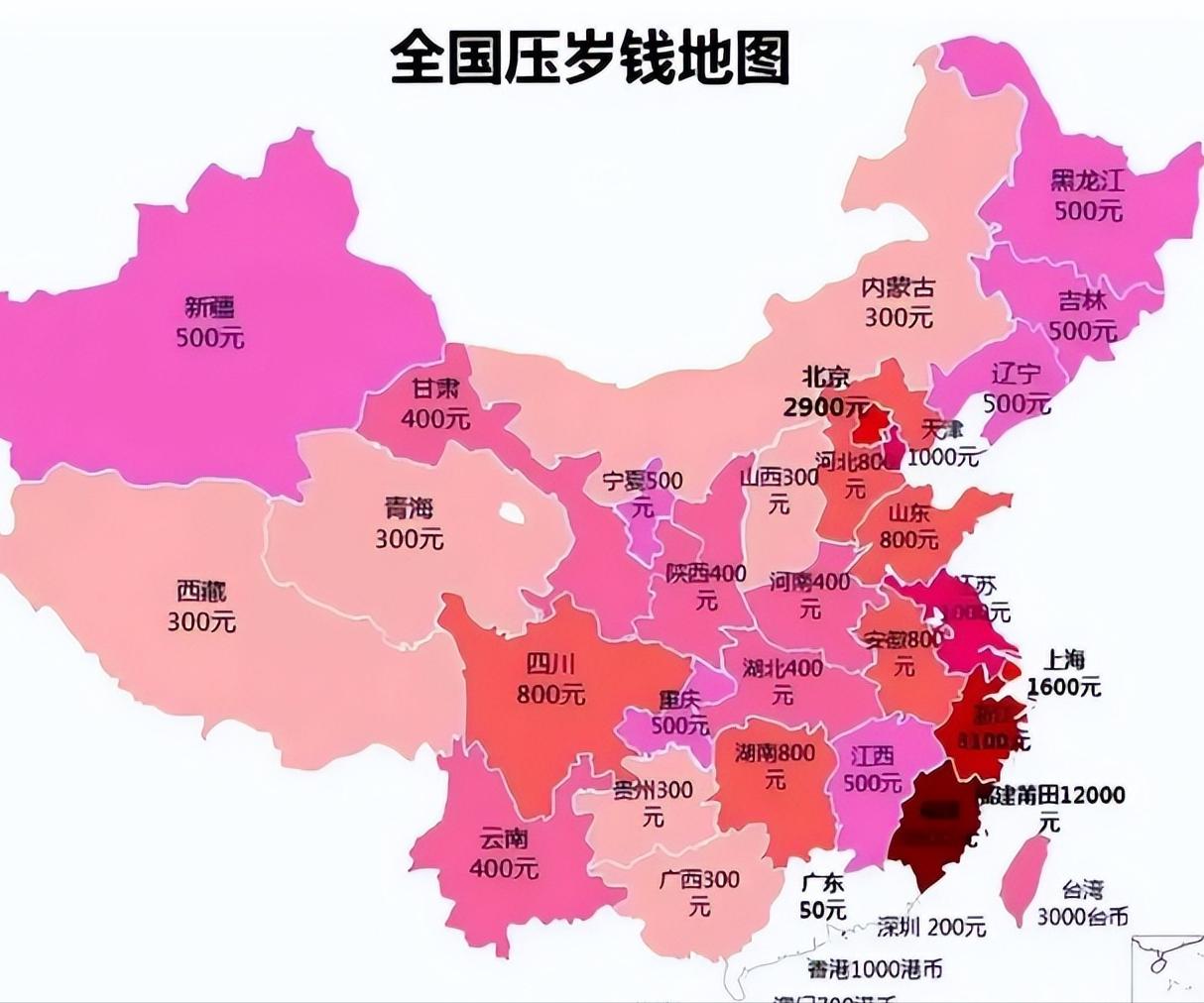 網上還流傳着一張“全國壓歲錢地圖”,全國各省市的壓歲錢金額差距還是挺大的,少的50元能搞定,多的高達3500元,網友們可參考。