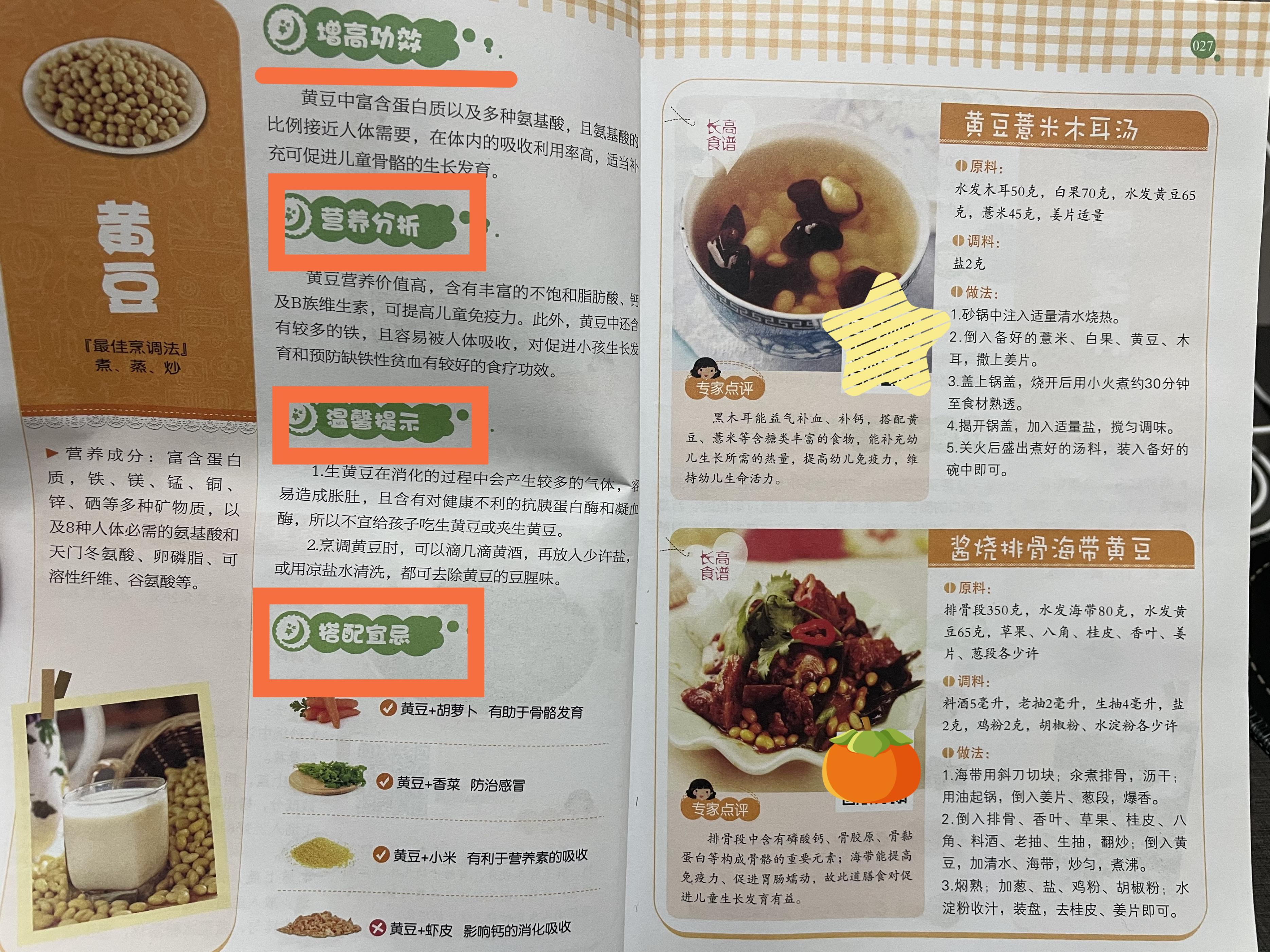 書中有增高功效、營養分析、溫馨提示、搭配宜忌。書中還介紹了黃豆的美食做法,如黃豆薏米木耳湯、醬燒排骨海帶黃豆。