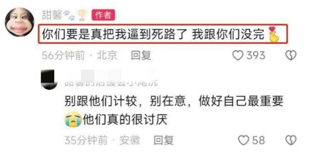 而甜馨曬一下生活也不影響到他們,甚至甜馨後來說:“你們要是真的把我逼到死路了,我跟你們沒完”。