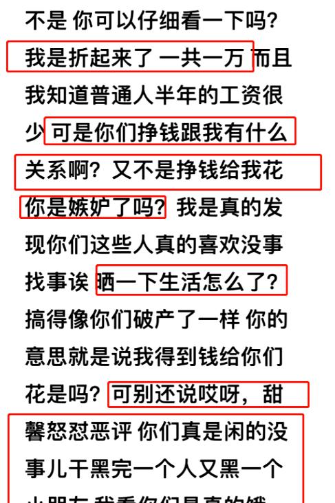 意思是說很多人嫉妒甜馨,其實很多人的工資很低,可能一年都存不下1萬塊錢,甜馨過個年領個紅包就有1萬塊錢,但是別人掙不掙錢,跟甜馨沒有關係。