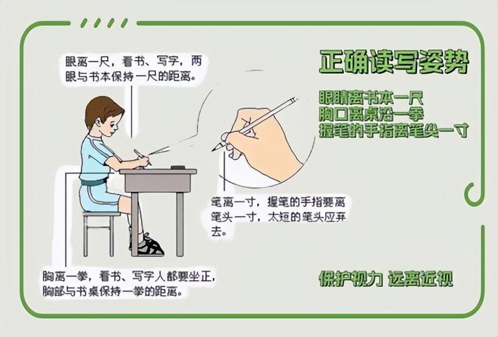 孩子看書學習時,保持正確的讀寫姿勢,對身體發育好,更重要的是有助預防近視。具體要求可以參考下圖。