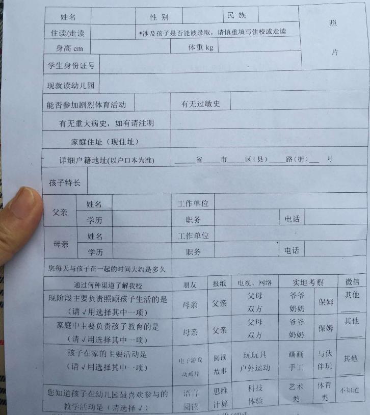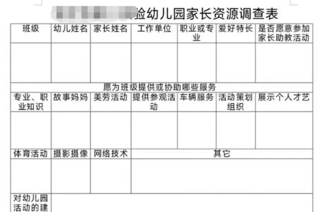 上面表格要求填寫爸爸媽媽的姓名,年齡,學歷,工作單位、職務等等,甚至還寫着爸爸媽媽能爲幼兒園提供什麼資源。