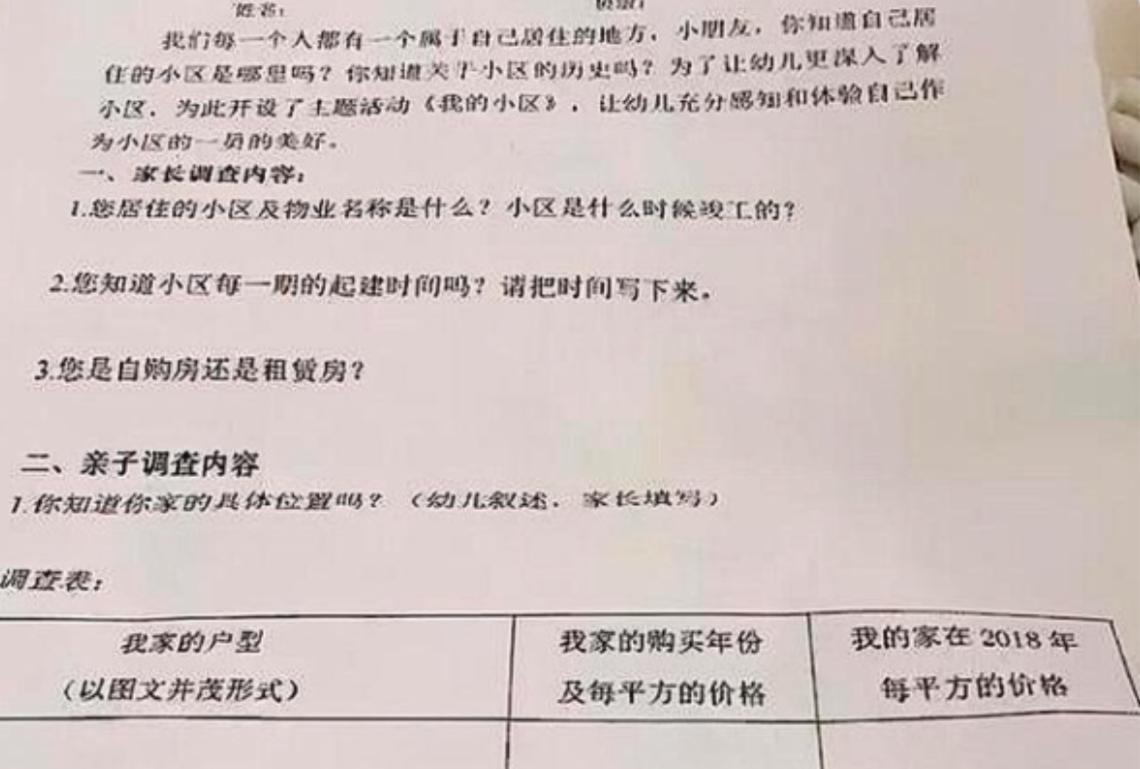還有一些幼兒園卻要寫自己家的房子,小區是在哪裏?小區是什麼時候竣工的?你們家是自己買的房子,還是租的房子?你們家的具體位置在哪裏?這雖然像是老師佈置的家庭作業,但其實通過這樣的一個家庭作業也能瞭解孩子的家庭情況。
