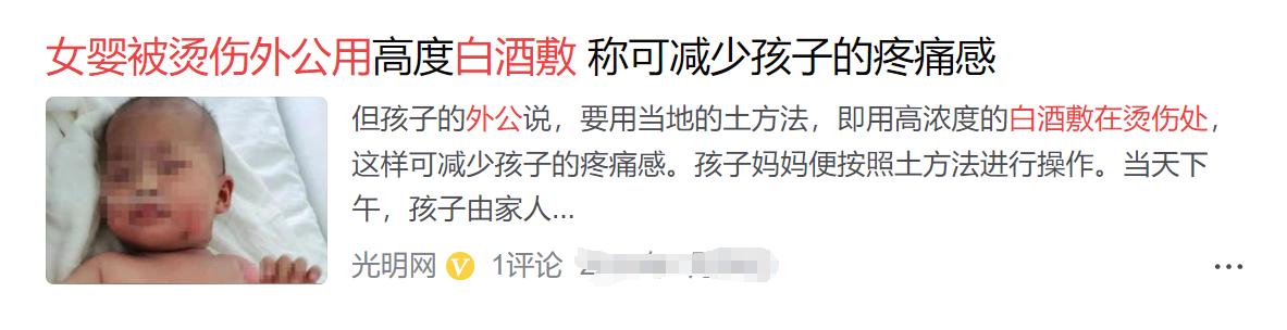一個6個月大的女嬰不小心被燙傷,這時候外公就想起了一個偏方,用泡了白酒的毛巾包裹孩子被燙傷的地方,說這樣可以消毒。