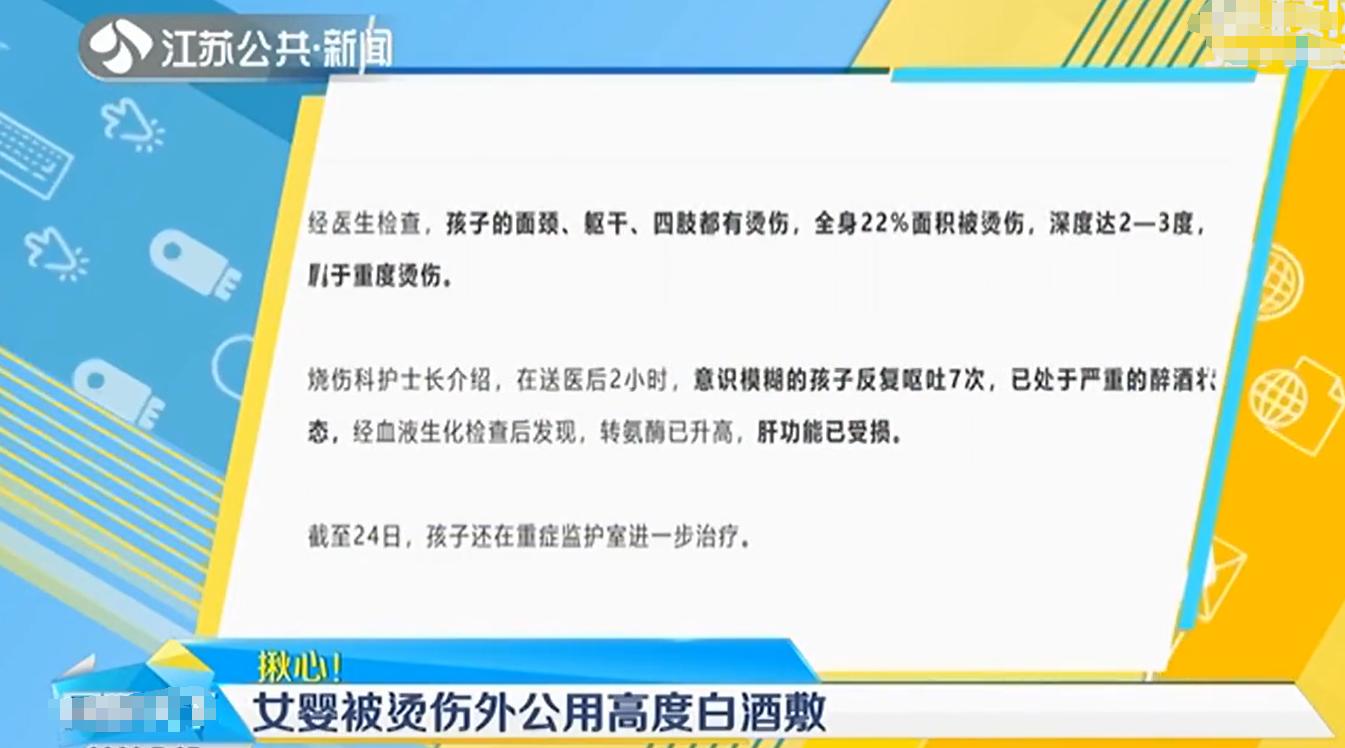 醫生檢查之後說孩子的燙傷變成了重度燙傷,而檢查的時候發現孩子的轉氨酶升高,肝臟已經受損。也就是因爲外公的一個急救動作,導致孩子被燙傷的部位雪上加霜,本來只是燙傷,結果變成了加上酒精中毒引發了孩子肝臟的傷害。#我來嘮家常#
