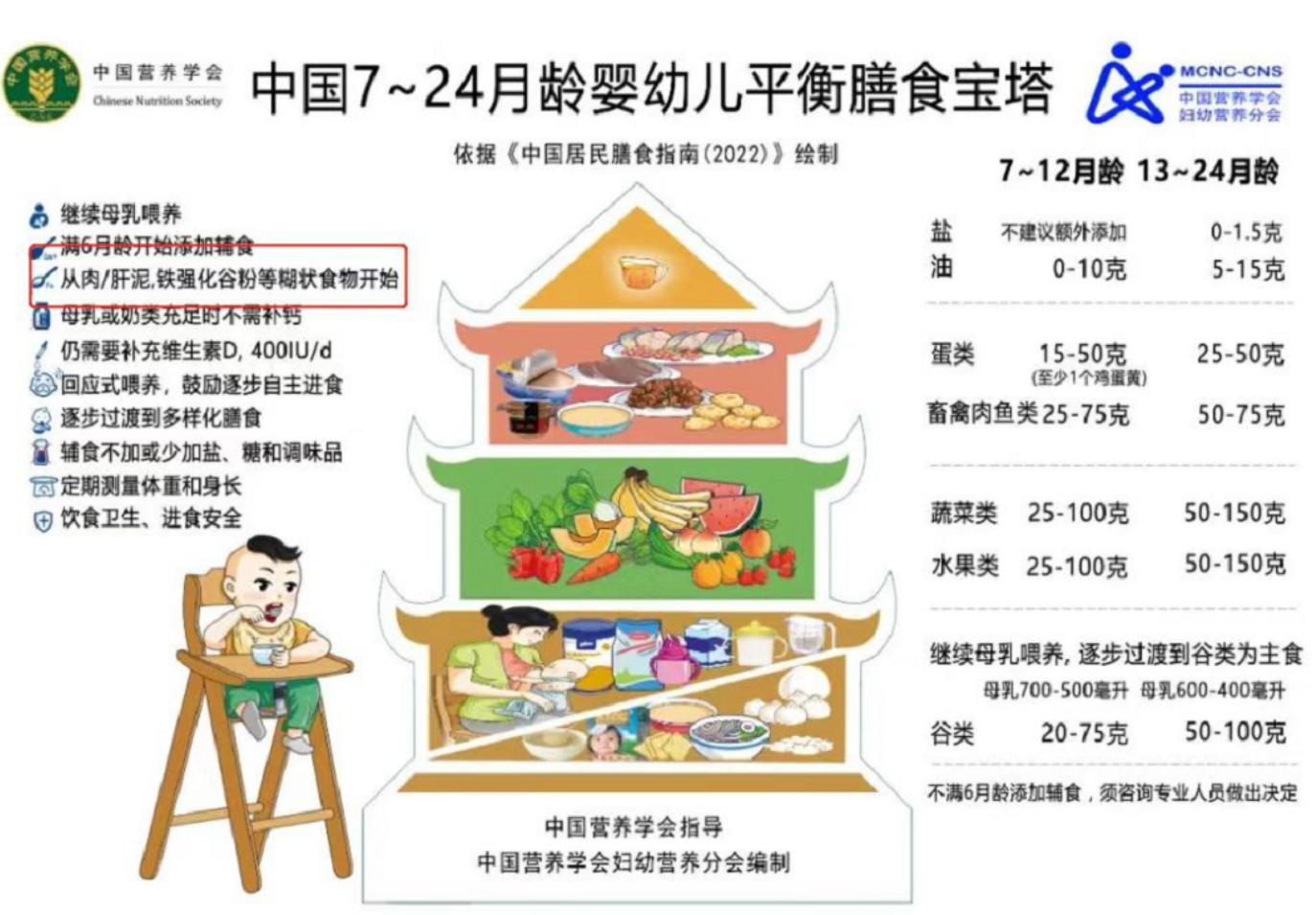 所以這時候添加輔食要趕緊給孩子補鐵,肉泥、肝泥的鐵含量以及吸收率會更高一些,這時候可以考慮一開始就給孩子喫肉泥肝泥。