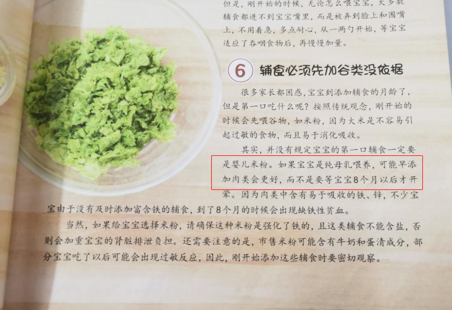 所以劉長偉也在他的《輔食每週喫什麼》這本書提到:母乳餵養的寶寶建議第一口輔食喫肉或者肝泥會比較好一些。
