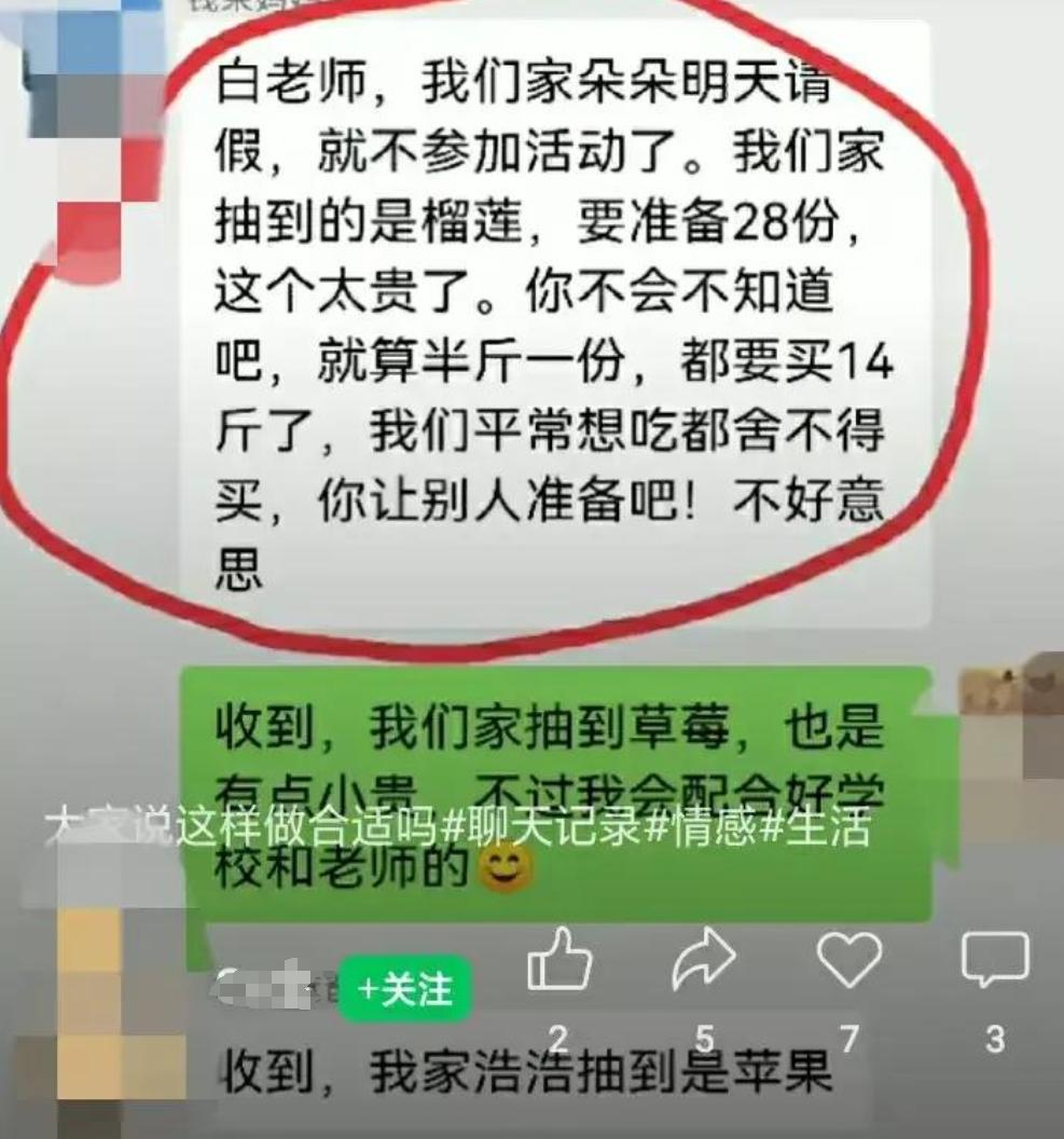 沒想到接下來一個家長開始陰陽怪氣地說:我們家抽到草莓,也是有點小貴,但是會配合好學校和老師的,這不是在內涵抽到榴蓮的家長小氣嗎!