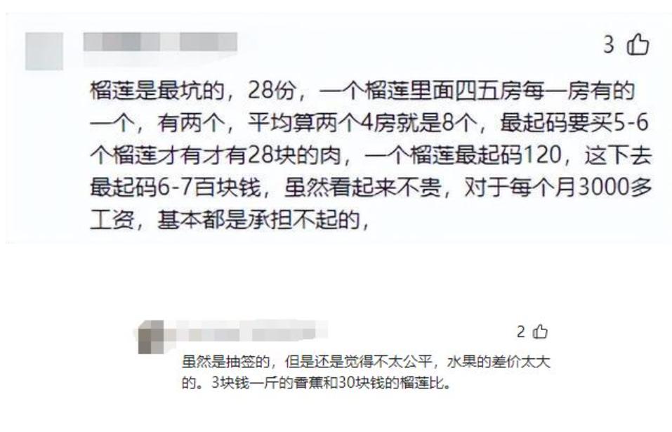 看到這裏很多家長都表示同情,榴蓮是最坑的,如果28份的話,一個榴蓮有四房,有些一房裏面有一個有一些有兩個,起碼要買5個榴蓮,5個榴蓮加起來至少是六七百塊錢,要知道有一些家庭,一個月的生活費也就是1000來塊錢,一個榴蓮就把家裏面20多天的伙食費給去掉了,這對於家長來說確實是非常貴的一個支出。
