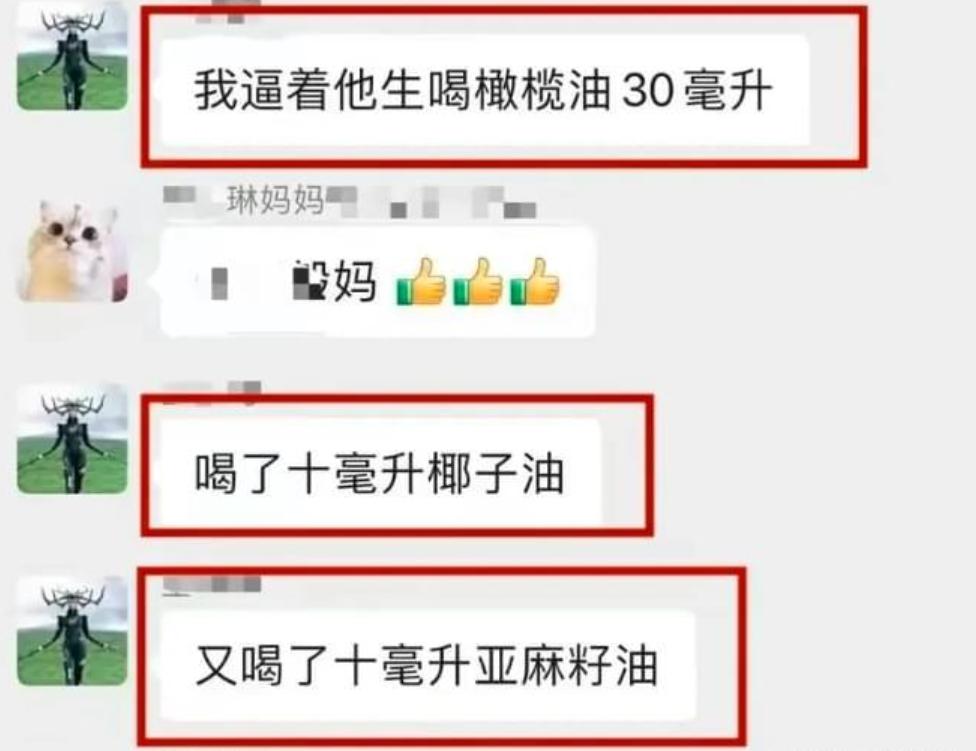 還記得前段時間那個家長逼着孩子喝油的事件嗎?就是因爲孩子去學校喫了同學們的生日蛋糕,回到家裏面告訴媽媽之後,這個媽媽大發雷霆,逼着兒子生喝了30毫升的橄欖油,喝了10毫升的椰子油,又喝了10毫升的亞麻籽油。