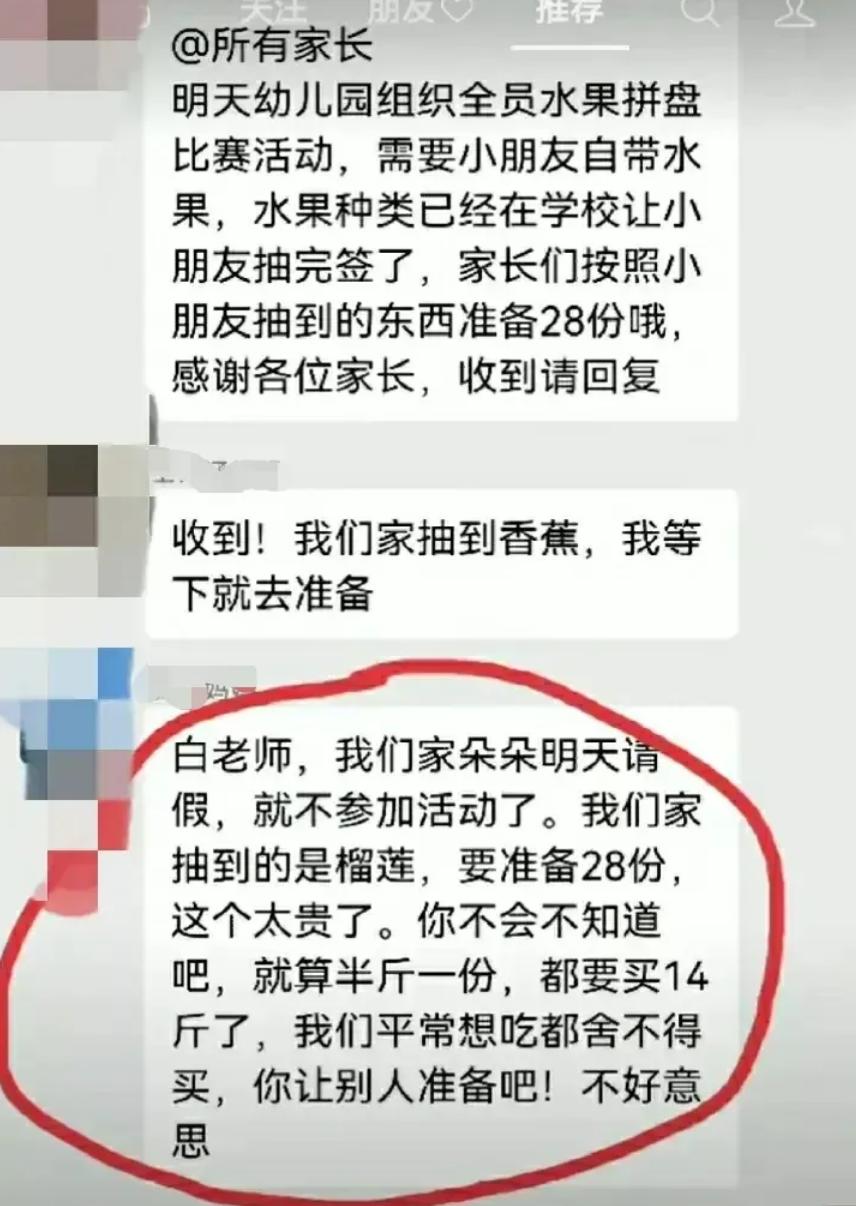有一個家長就抽到了28份的榴蓮,他覺得榴蓮太貴了,就算是半斤一份也要買14斤,平時家長們都捨不得喫,結果卻要給孩子拿去分給其他幼兒園的小朋友喫,家長就覺得傷不起,於是決定請假。