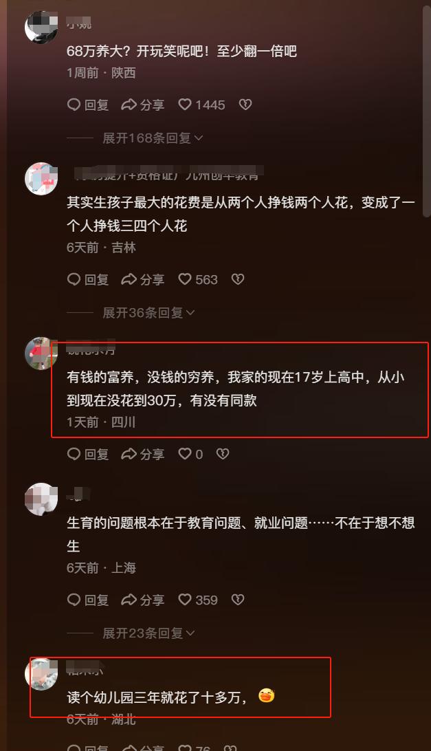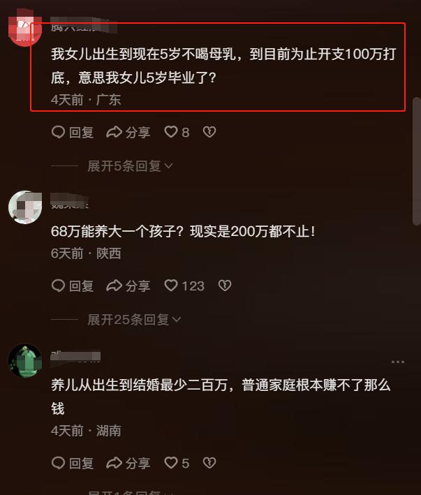 還有網友說自己孩子中考那一年的費用就已經是60多萬了。還有網友說68萬咋算出來的?現在給我200萬都不願意多生一個。