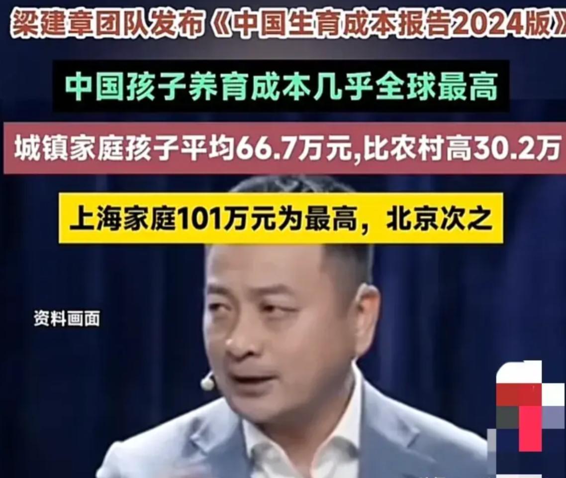人口學家梁建章團隊發佈《中國生育成本報告2024版》就稱:中國孩子養育成本幾乎是全球最高的,城鎮家庭的孩子平均是66.7萬元,比農村的高出30.2萬元,其中上海家庭101萬元是最高的,北京市排名第二。