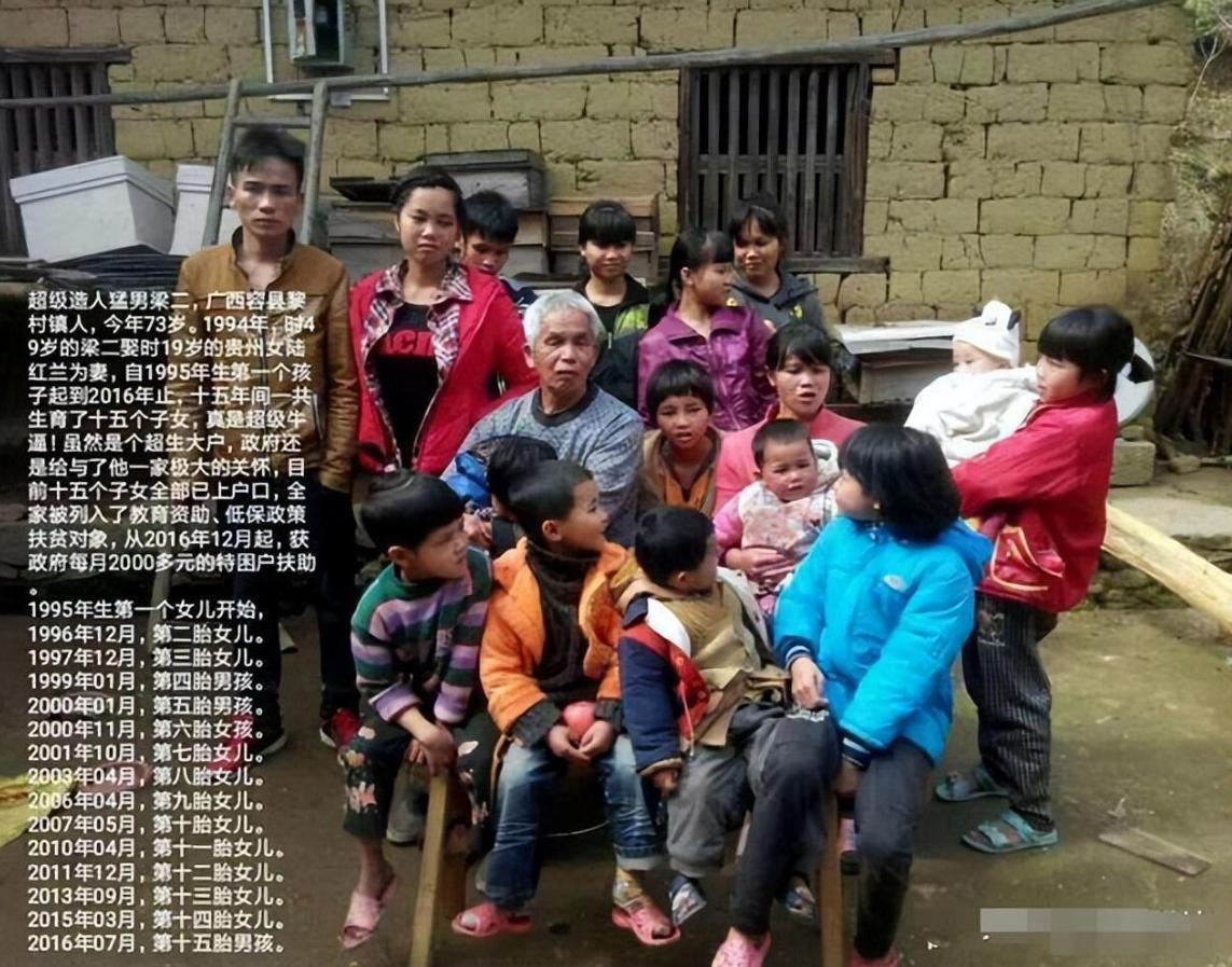 最後一個孩子出生的時候是2016年,梁二就已經70歲了,要知道當時全家15個孩子,再加上兩個大人,就擠在一個瓦房裏面,也是非常的困難,孩子也穿得破破爛爛的,甚至生孩子的時候都是在家裏面生的,壓根就沒有很好的坐月子,但是15個孩子都養活下來了,而且一個都沒有分給別人,兩夫妻就靠自己的雙手把孩子慢慢養大了!