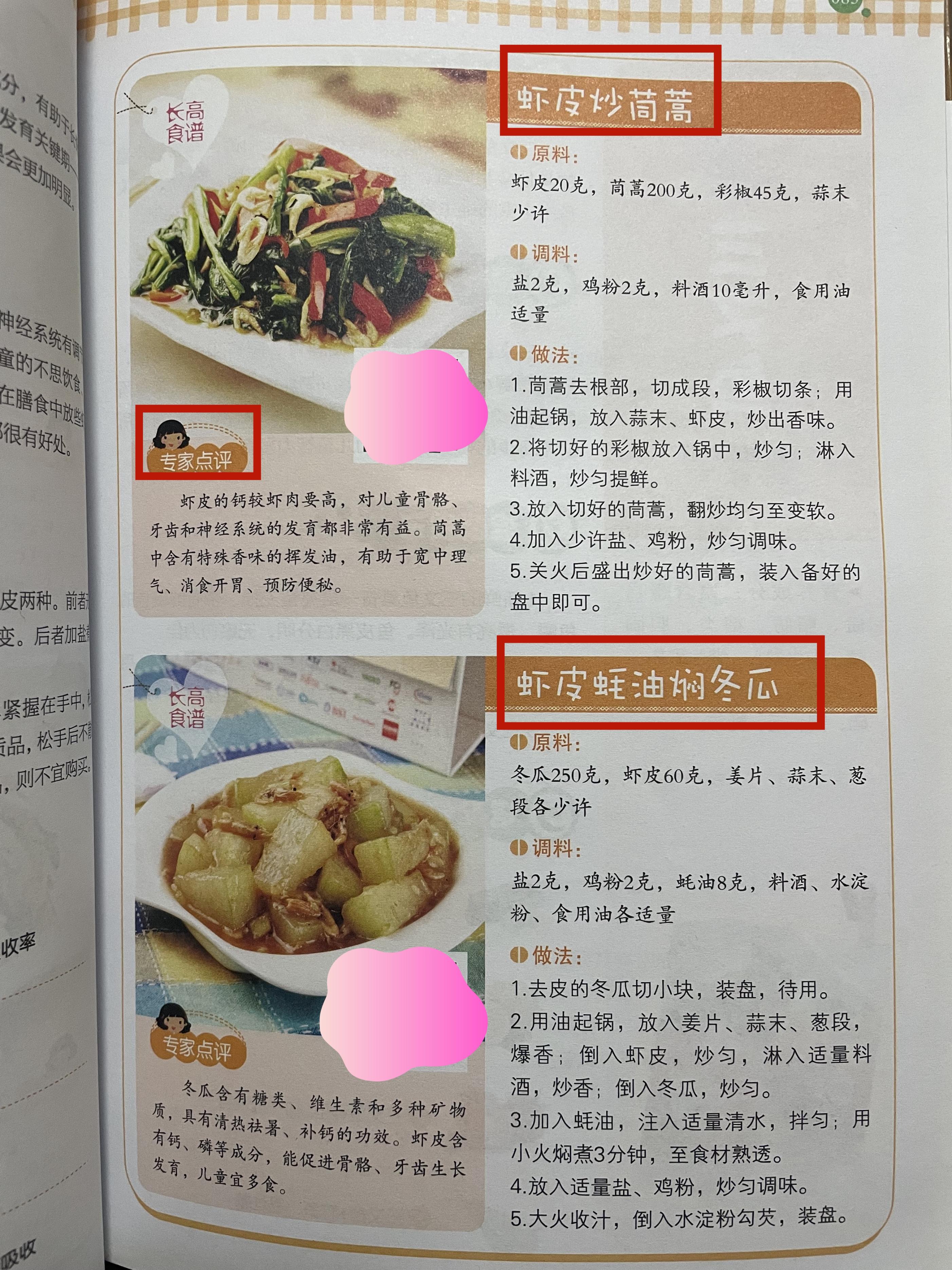 《兒童長高食譜》第85頁,就介紹了蝦皮炒茼蒿、蝦皮耗油燜冬瓜的做法。這兩道菜對孩子的骨骼和神經發育,都十分有益處。補鈣作用明顯,能促進女孩竄個子。