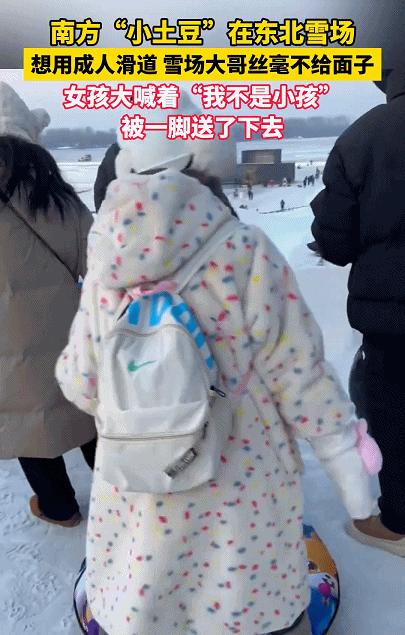 東北大哥誤把這位“南方小土豆”,當作是個未成年的小孩子,一腳從冰滑梯上給溫和地“安排”下去了。