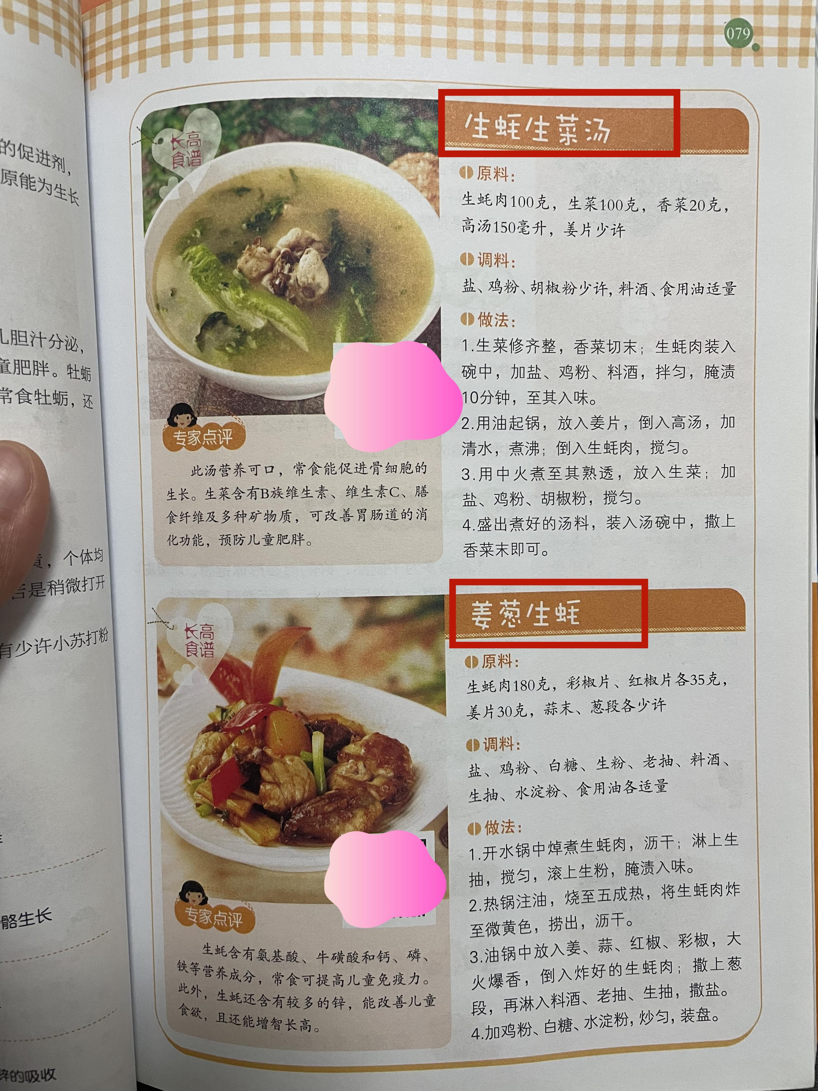 牡蠣,富含鋅元素,有氨基酸、牛磺酸和鈣等成分,可以幫孩子促進生長髮育,提高免疫力。牡蠣可以做成生蠔生菜湯、姜蔥生蠔等,製作方法在《兒童長高食譜》第79頁,還有小視頻看,父母可以照着一步步操作,很簡單。