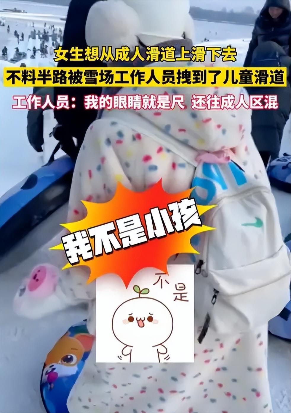 一位身高1米5幾的成年女孩子,排隊玩滑梯,被東北哈爾濱的看場大哥誤會了,誤以爲是個小孩子。