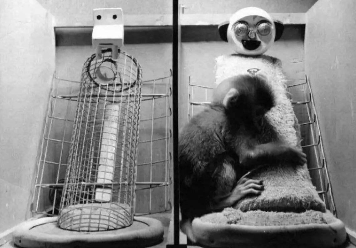但是哈利·哈洛發現,這些由絨布媽媽撫養長大的猴子,不會跟其他孩子一起玩,性格很孤僻,到了成年之後也不會繁衍後代。