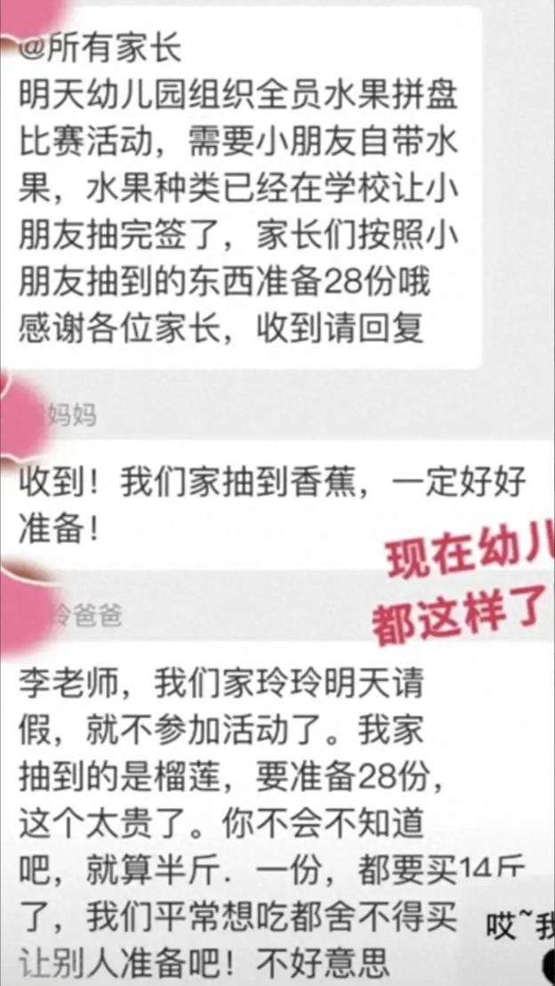 之前在網上就看過一個新聞,一個幼兒園裏面水果拼盤比賽活動,要求家長們給孩子準備水果帶來學校,而要帶什麼水果是抽籤決定的。