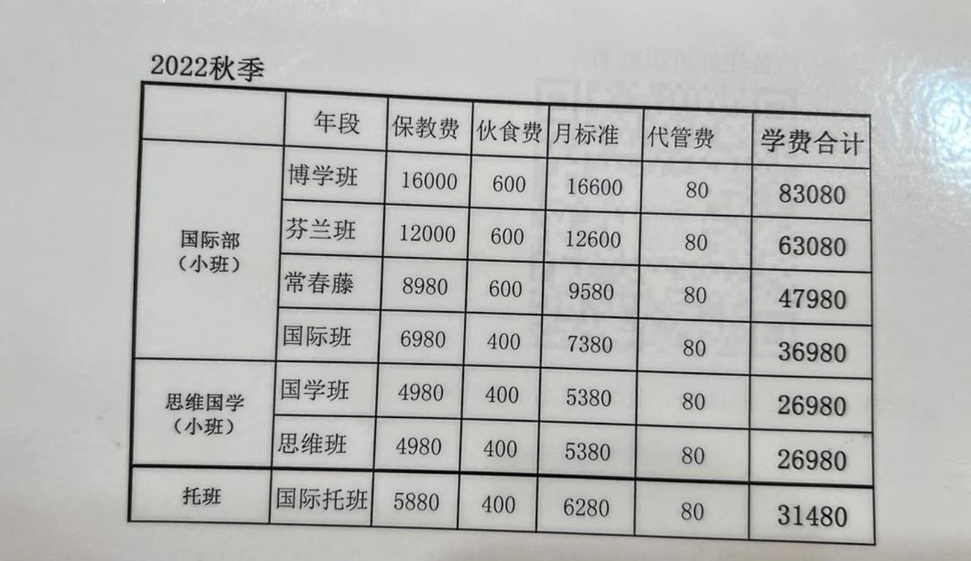 另一個家長曬出自己幼兒園的收費單,因爲是國際學校,還有幾種班可以選擇,一種博學班一個學期就是8萬多,另外一個芬蘭班就是6萬多,常春藤班是4萬多,還有國際班是3萬多,普通的國際班也要36,980塊錢。
