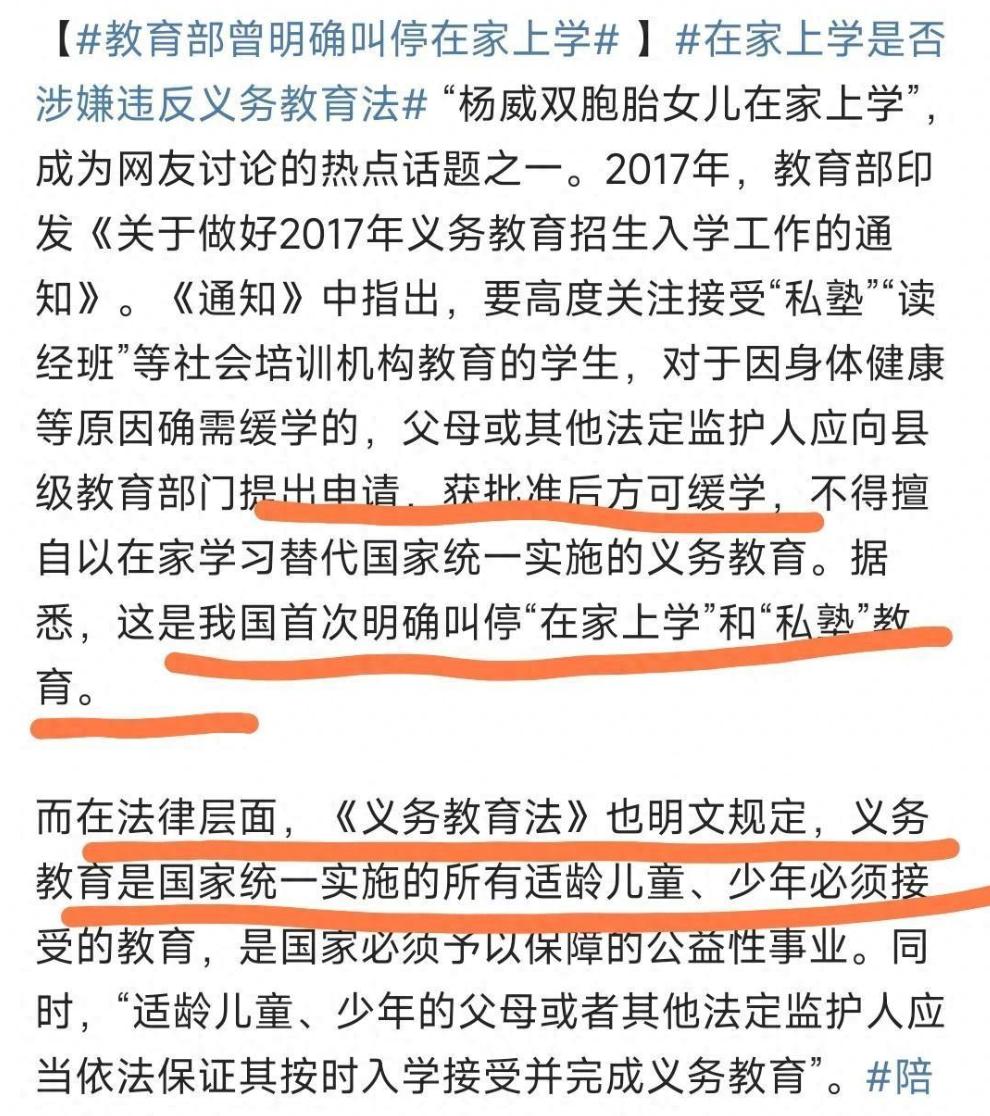 楊威雙胞胎女兒在家上學,教育部早已明確叫停!普通父母別效仿