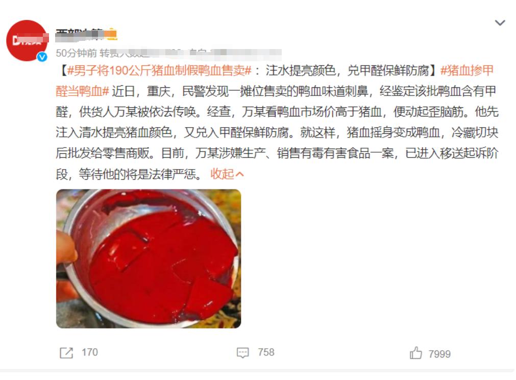 315剛曝光了,重慶一個男子在豬血裏面摻甲醛,賣出190公斤的假鴨血,也就是拿豬血來當鴨血,而且還摻了甲醛,不僅是假而且還有毒。